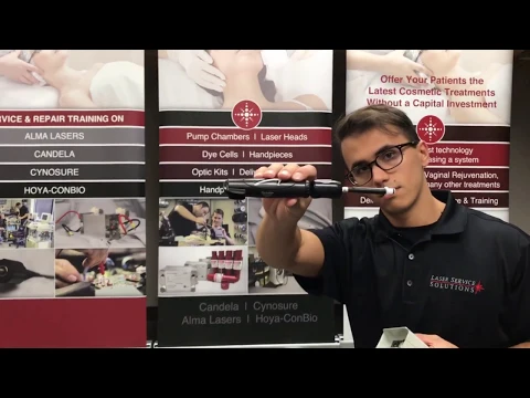 If you have to send in your soprano or original Soprano laser equipment handpiece for repair service,s especially during the winter, you’re going to have to drain it. In order to drain it, you’re going to need a drain fitting here and you’re also going to need a hand pump. Both of these are to be plugged into the actual butt end connector of the handpiece itself. Right now, as you can see, they’re in the locked position. What you’re going to have to do is actually depress both the top and bottom buttons like this and then insert it.